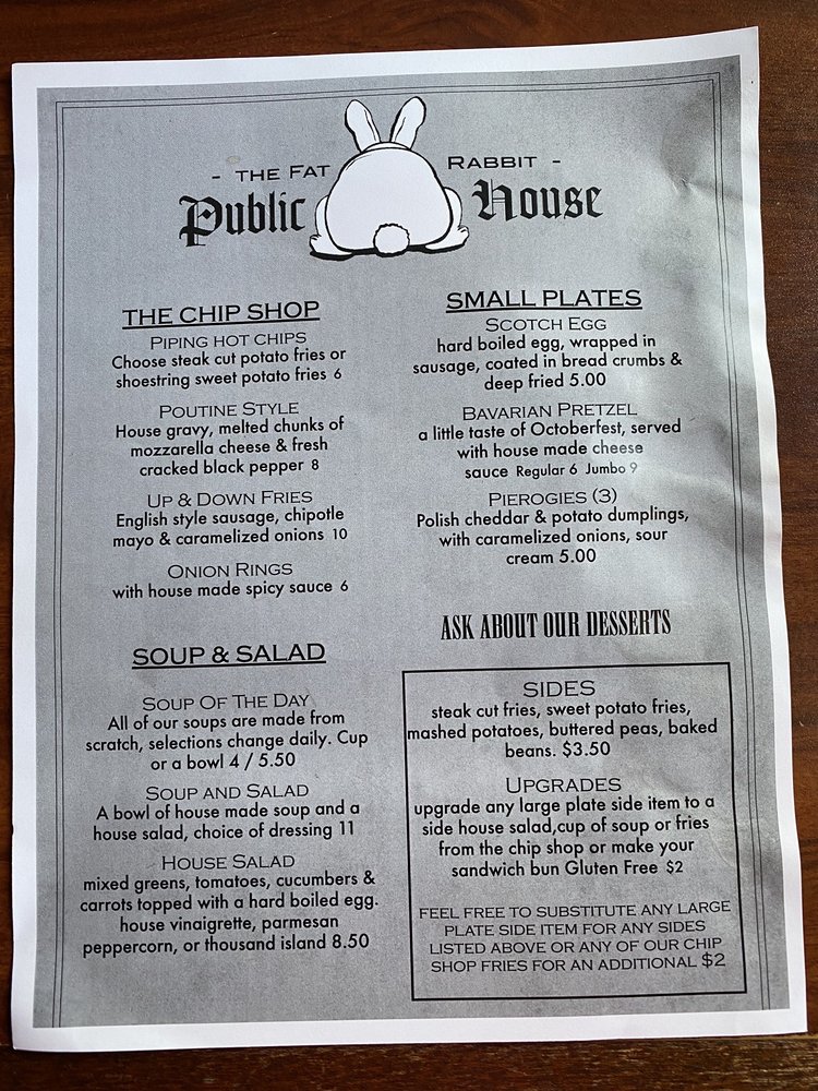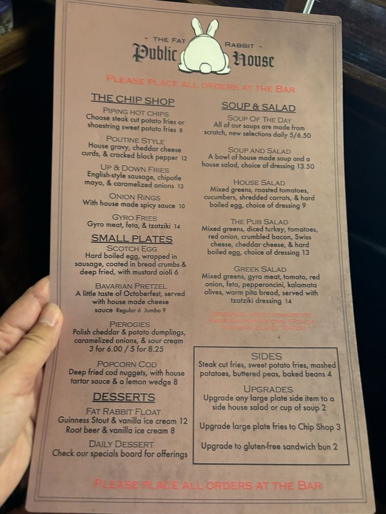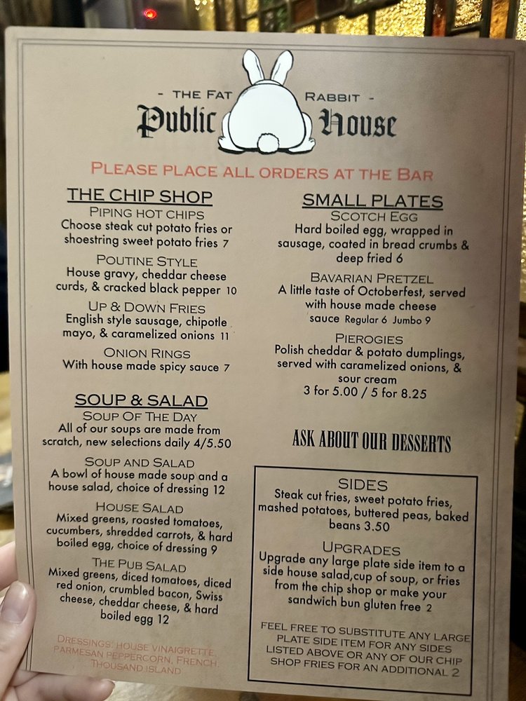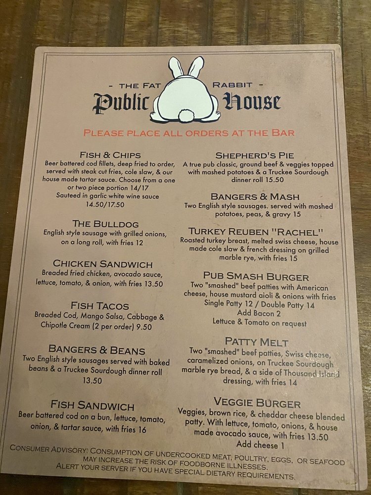 The Fat Rabbit Public House in Folsom, CA offers a cozy British pub experience with a focus on Fish & Chips. With a diverse menu that includes vegetarian options, this pub is perfect for lunch or dinner. Customers rave about the flavorful double patty burger, Barvarian Pretzel with cheese sauce, and gyros with home-style fries. The ambiance is described as home-y and historic, making it a great spot for gathering with friends. The service is fast and efficient, even during busy times. The fish and chips stand out for their crispy coating and delicious flavors, while other popular dishes include schnitzel, Shepherds Pie, and Bangers & Mash. Overall, The Fat Rabbit Public House provides a welcoming atmosphere, excellent service, and mouth-watering British-inspired dishes that keep customers coming back for more.